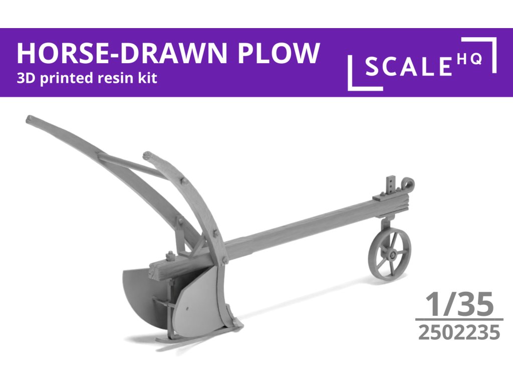 Detailní resinová stavebnice koňmi taženého pluhu, ideální doplněk pro dioramy statků a farem.